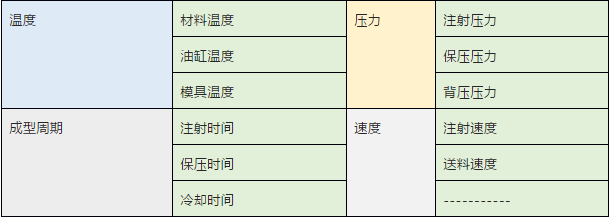 注射成型過程工藝參數(shù)涉及溫度、成型周期、壓力、速度四個方面,具體參數(shù)如表所示。